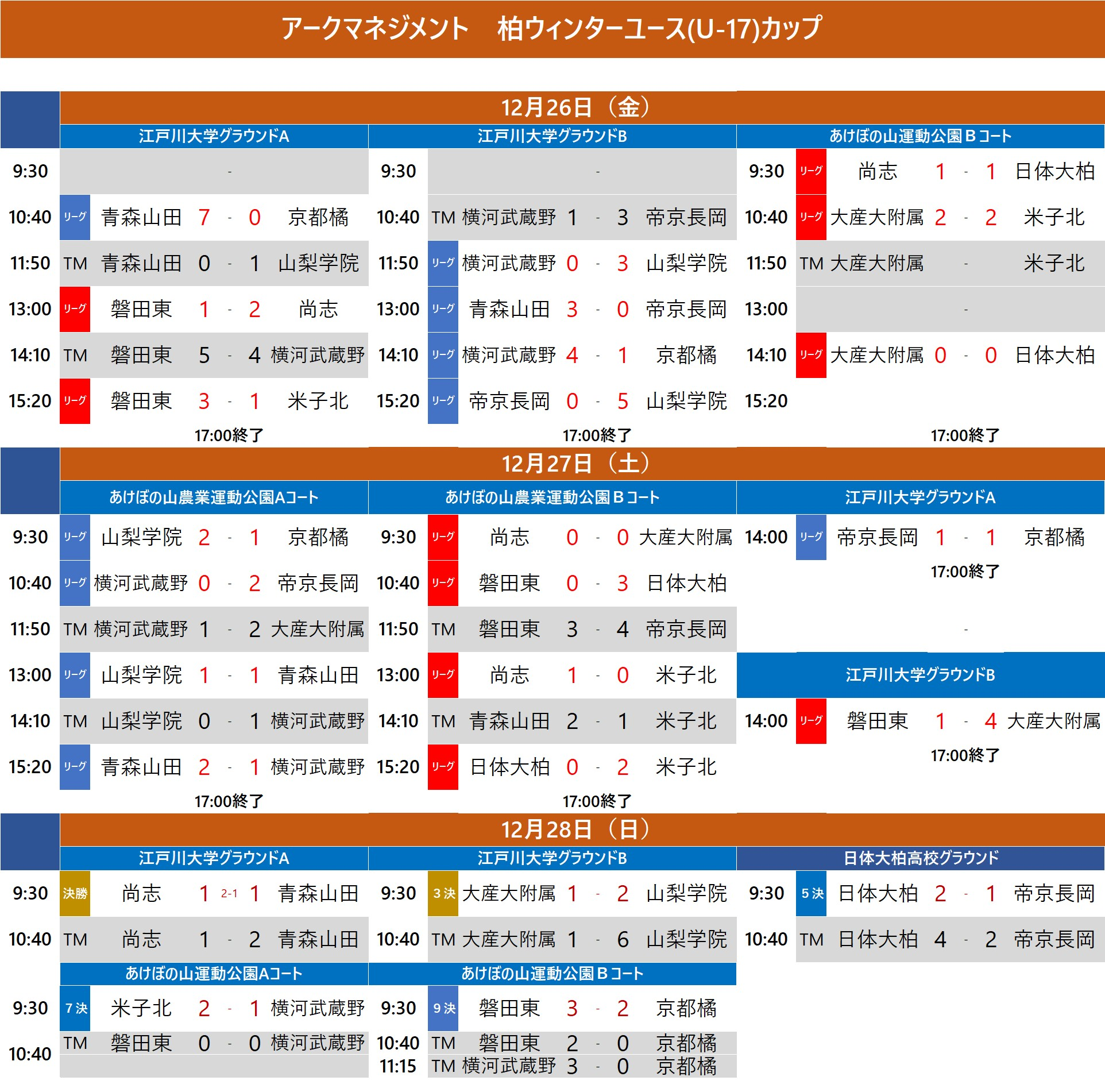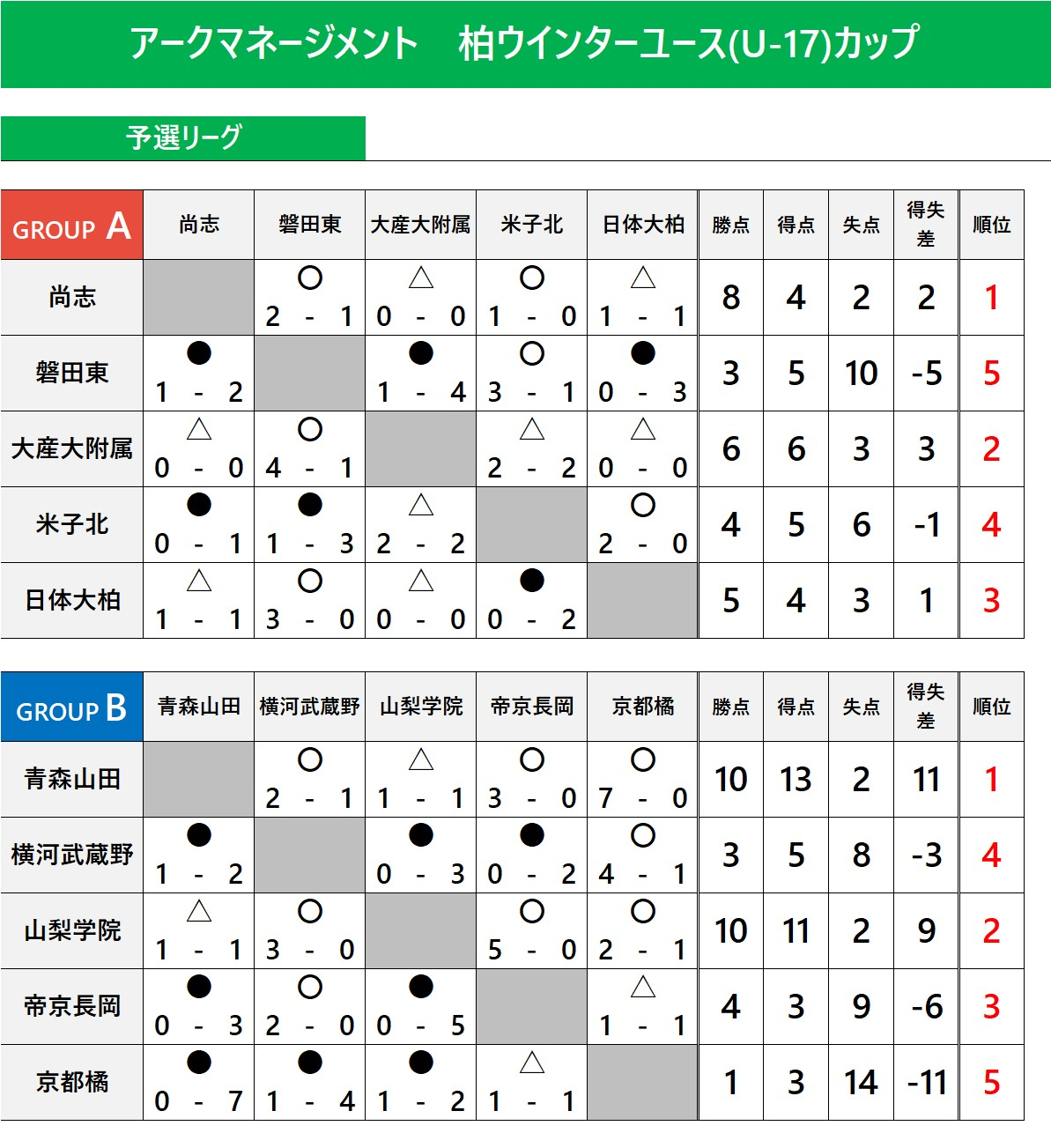 アークマネージメント柏ウィンターユースカップ2025 優勝 尚志高校 準優勝 青森山田高校 リーグ戦表 日程表 特別協賛 株式会社 アーク マネージメント 協賛 株式会社エイチ・アイ・エス 株式会社スポーツテクノ和広 広島建設株式会社 株式会社 ロックウェルズ 株式会社 クリーンアップサービス 有限会社 アーシア 株式会社 森栄工業所 ALL保険プラザ株式会社 フジタケ写真室 出場校一覧 日体大柏 青森山田 尚志 帝京長岡 横河武蔵野 山梨学院 岩田東 京都橘 大産大附属 米子北